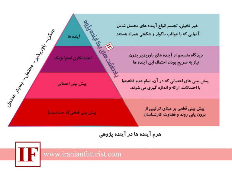 توصیفی شفاف از انواع مختلف آینده. (بالقوه، ممکن، باورپذیر، محتمل، بسیارمحتمل، پیشبینی شده و مرجح)