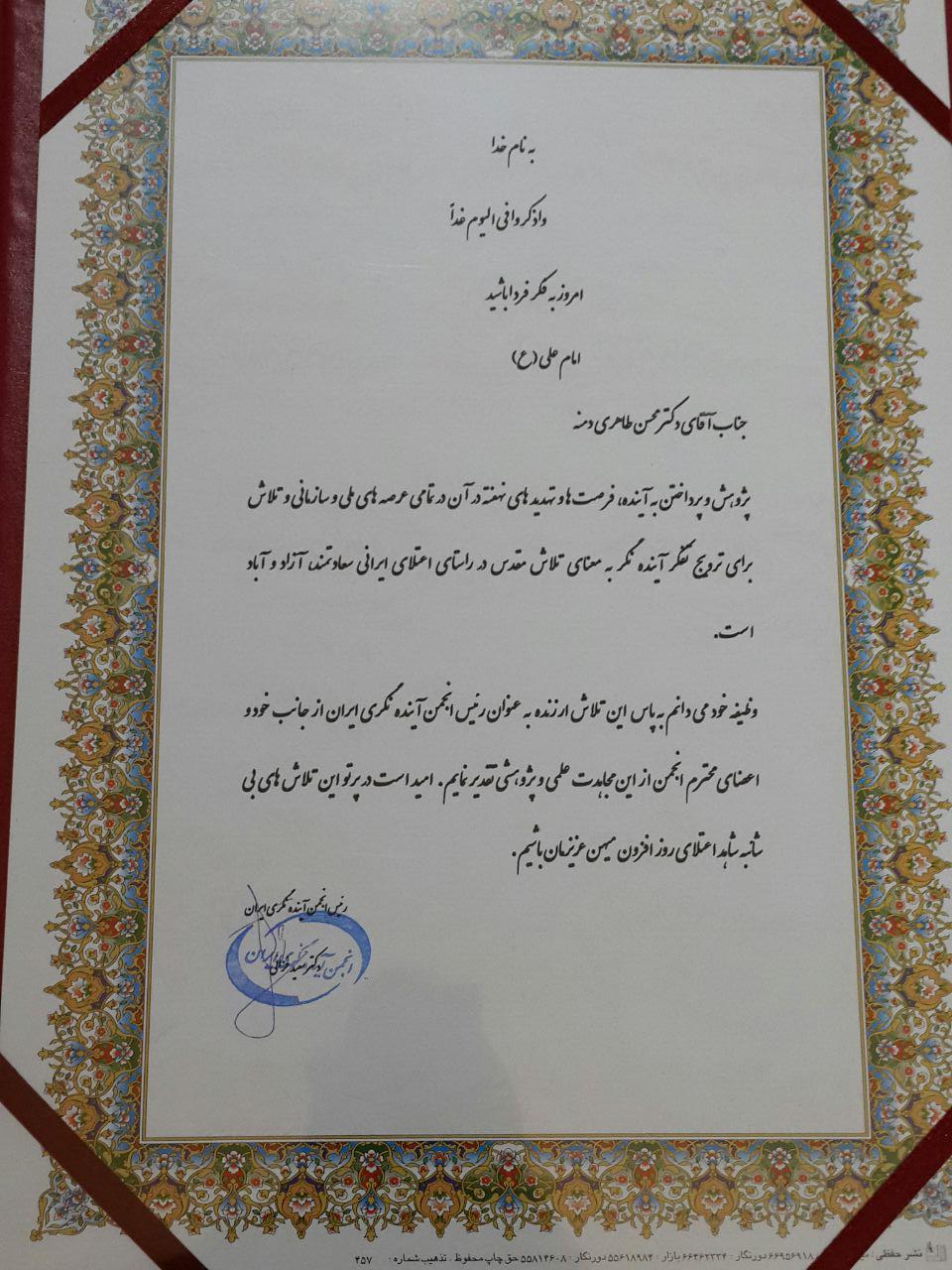 برای مراسم گرامیداشت روز جهانی آینده سال ۱۳۹۷ در انجمن آینده نگری ایران از آقای دکتر محسن طاهری دمنه به دلیل تلاشهای ایشان برای ترویج آینده پژوهی تقدیر گردید. این ترویج بیشتر معطوف به کارهای انجام شده در مدارس است.